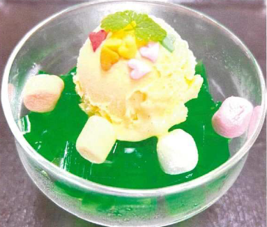 メロン風味の寒天にバニラアイスなどを添えた、爽やかなデザート。