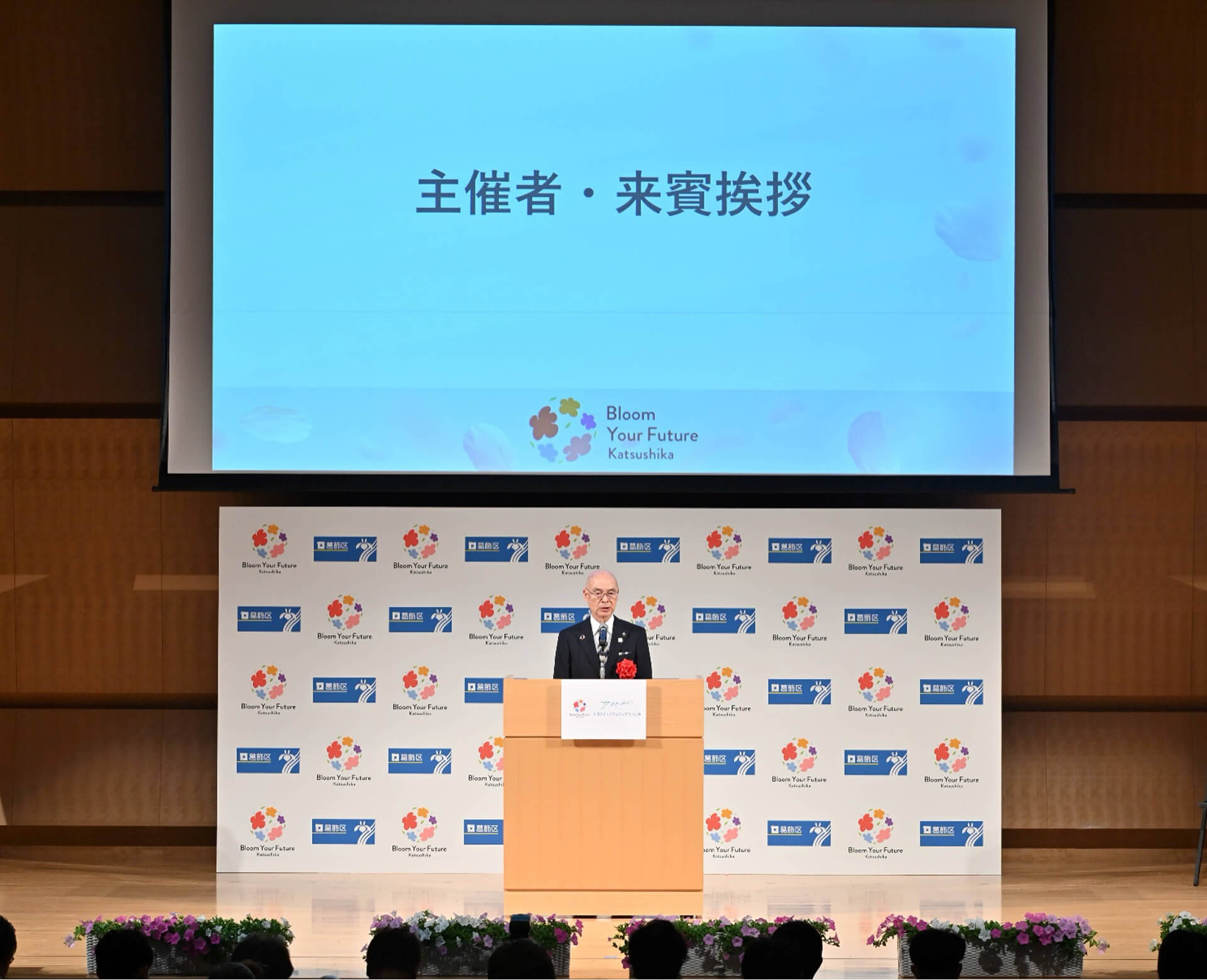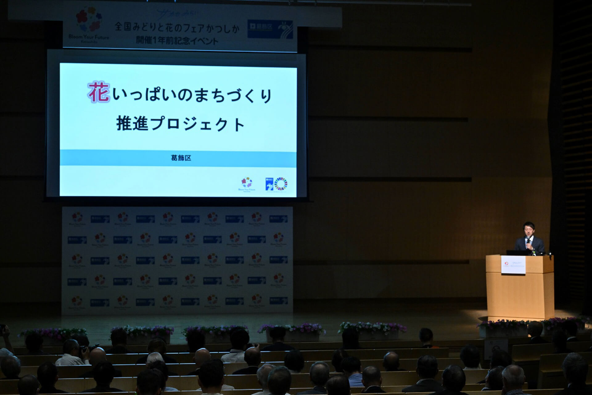 会場には葛飾区内で活動する、各種団体や自治体関係者、地域住民の皆さまを招待して、「全国みどりと花のフェアかつしか」が葛飾区をあげて全国に発信するイベントであることを葛飾区長が発表いたしました。