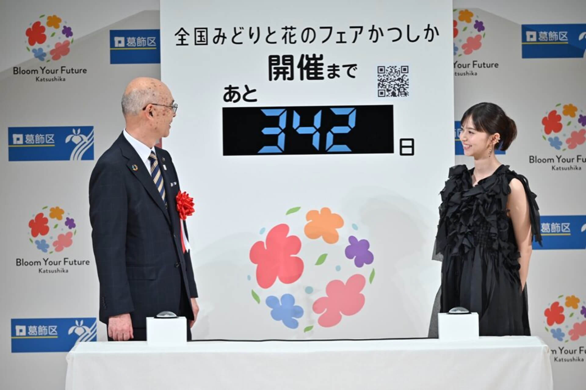 最後に、「全国みどりと花のフェアかつしか」開催までの日数を表示するカウントダウンクロックが発表され、開催1年前記念イベントは盛況のうちに幕を閉じました。